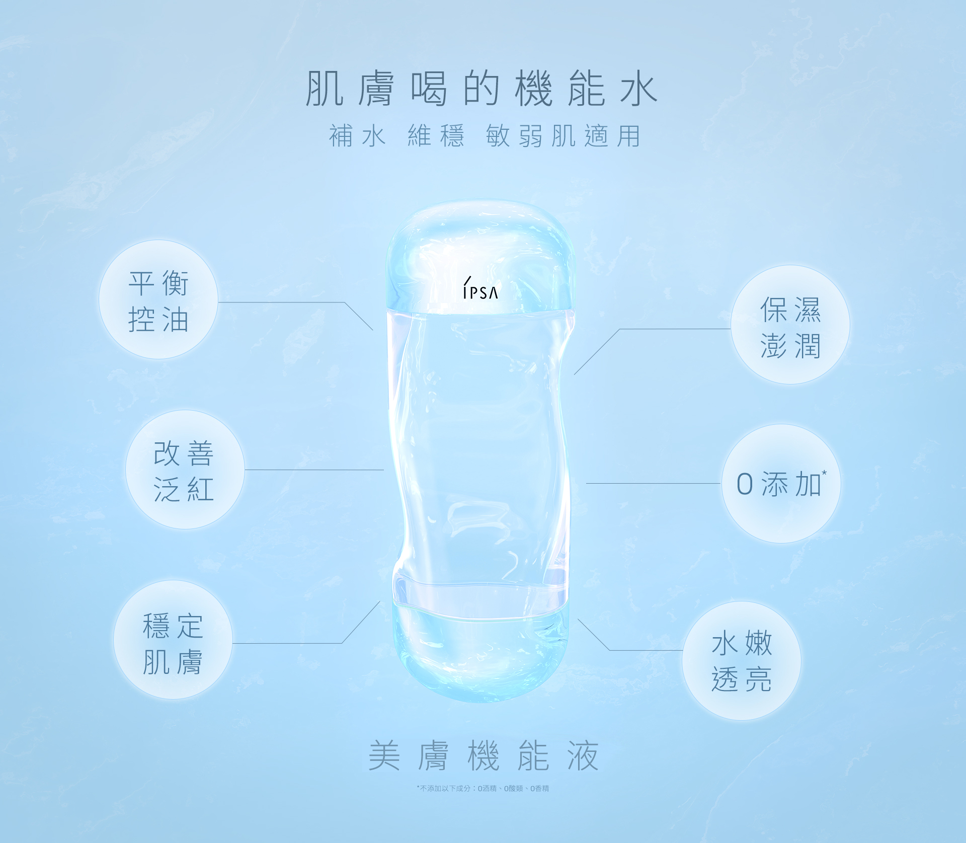 調理肌膚水油均衡, 使肌膚不易發生乾荒、出油等困擾, 創造水感膚觸的無酒精高機能化妝液。